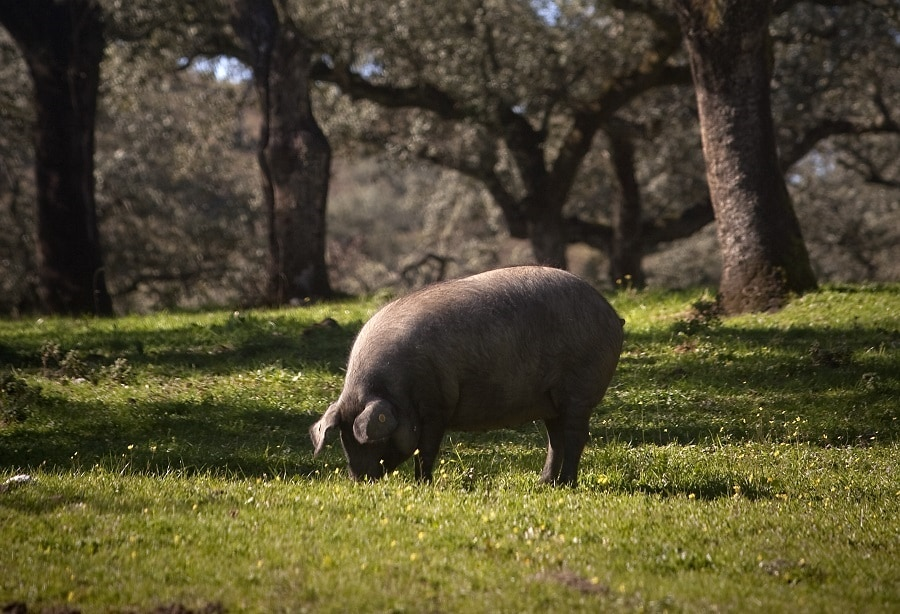 La alimentación con bellotas y pasto aporta una grasa infiltrada en la carne, lo que le da un sabor único y una textura jugosa.