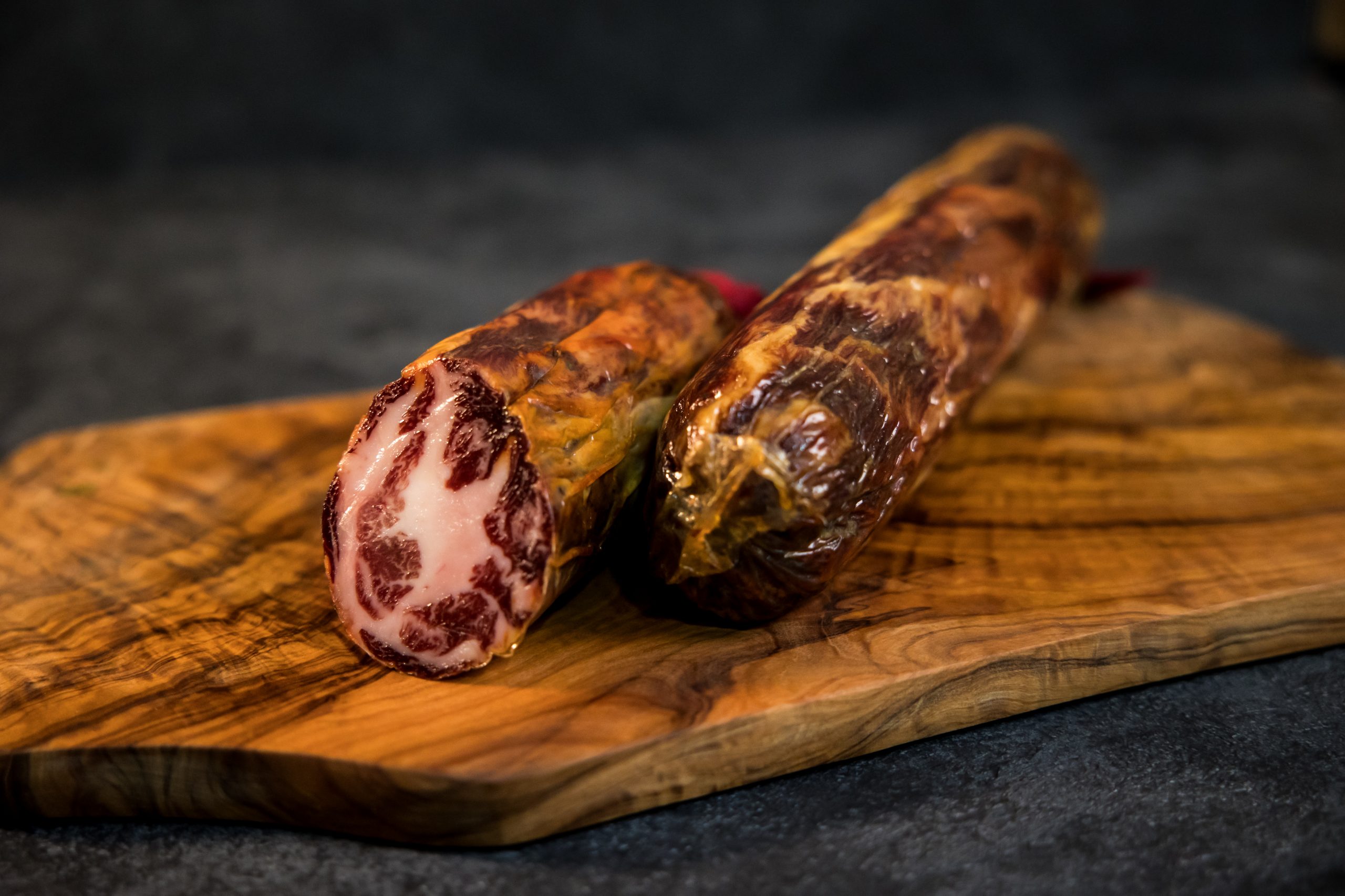 El Cabecero de lomo o COPPA de Maextre es una pieza noble, cuidadosamente seleccionada, con un corte uniforme y ligero. Su textura suave y su aroma delicado hacen de cada bocado una experiencia única. Procedente de cerdos 100% ibéricos de bellota, como todos los productos de la marca, este producto refleja nuestro compromiso con la excelencia.